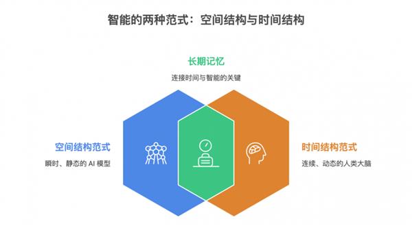 今年10月27-28日,他在天桥脑科学研究院在美国旧金山举办的首届天桥脑科学研究院AI驱动科学研讨会(Symposium for AI Accelerated Science,AIAS 2025)上系统阐述了包括“长期记忆”在内的发现式智能五种核心能力。他指出,当今的 AI 建立在“空间结构”范式之上——这种范式是「瞬时的」「静态的」,本质上通过规模化参数去拟合世界的“快照”;而人类大脑的“时间结构”范式是「连续的」「动态的」,其目的在于管理与预测时间流中的信息。在这其中,“长期记忆”正是连接时间与智能的关键环节。