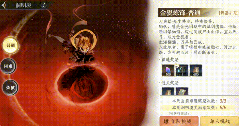 然后是洞明境这属于周常挑战,玩家可以选择单人或组队进入,副本设置有普通、困难、炼狱三种模式,通过能拿到高阶心法和养成资源,目前洞明境有三大主题boss等待挑战,分别是狮妖、青木阵盘和涂山青青。