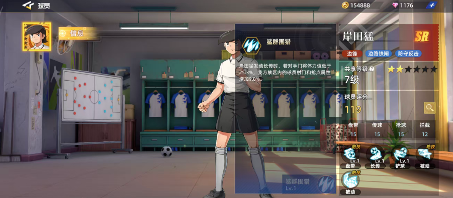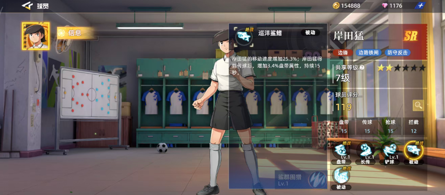 岸田猛主要活跃于球场两侧,定位为边路球员,因此其属性与技能设计也更偏向边锋位置的应用场景。尽管当前可选的SR级边锋数量有限,但在这一梯队中,岸田猛仍属于功能性较为全面的选择之一。他在防守端的表现尤为突出,不仅能有效覆盖边路区域,还能根据对手出球方向迅速组织反击,具备一定的战术延展性。