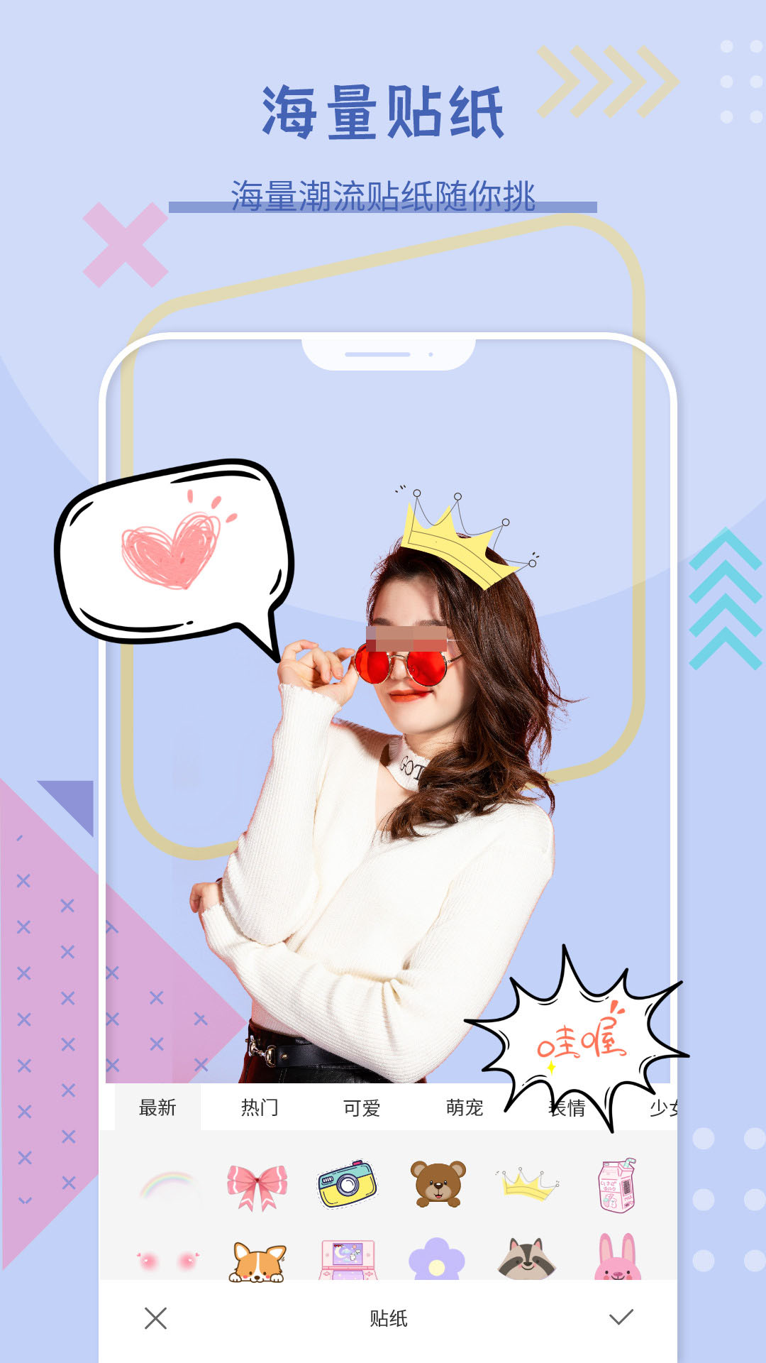 专为前置镜头优化设计,具备高精度人脸追踪与微表情识别能力。应用内提供超百款主题贴纸、数十种边框样式及多尺寸拼图布局,支持自由拖拽、缩放与旋转操作;更引入动态AR相框与手势触发动效,让单次自拍也能呈现丰富视觉层次与趣味交互感。