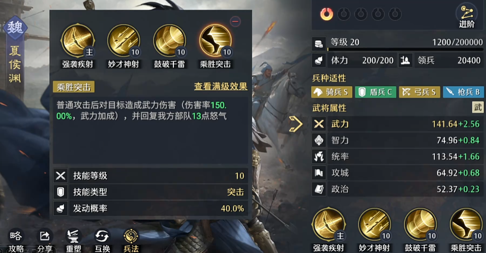 此外,配置“乘胜出击”技能可进一步优化节奏,每次对目标造成伤害时回复13点怒气。虽然这是突击类效果,但由于队伍中存在张辽,其自带技能可在行动时以20%概率进入连击状态,并提升自身15点武力。一旦触发连击,相当于两次出手,极大提高了夏侯渊的突击频率和怒气回复效率。