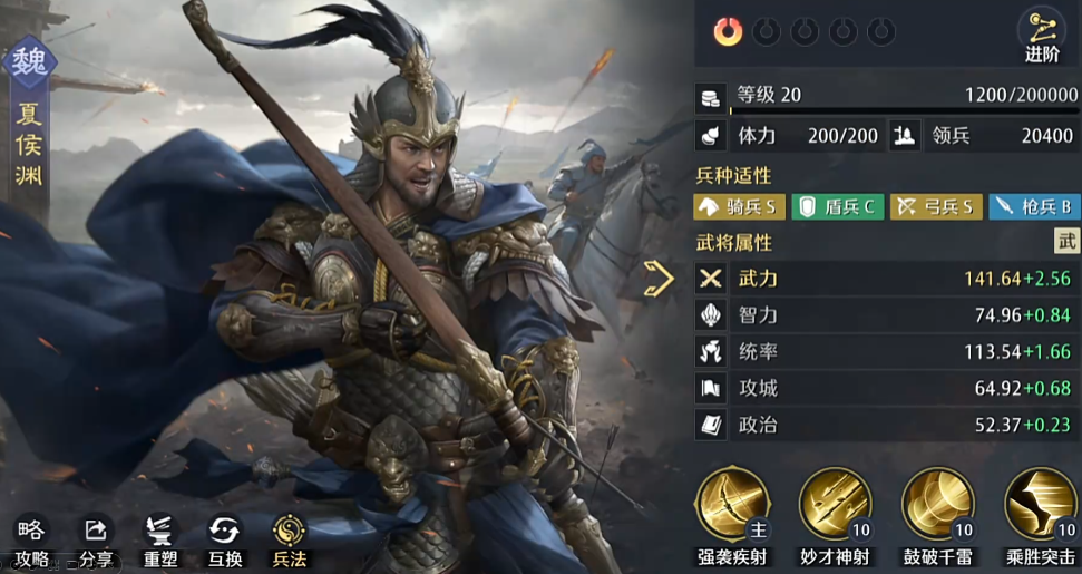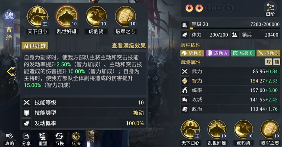 曹操在此阵容中承担辅助核心角色,其自带技能不仅能提高我方主动战法与突击技能的发动几率,还能使相关技能伤害提升10%。这意味着在夏侯渊已有40%增伤的基础上,再次叠加10%,最终达到50%的综合加成。若再配合“虎豹骑”战法,可实现高频突击与技能衔接,同时提升部队在地图上的行军速度,增强机动性。