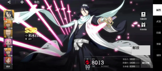 第三位关键角色为朽木白哉,他是斩系流派阵容中的核心支撑。当其释放技能时,若队伍中全员为斩属性角色,则可触发高达30%的全队伤害增益效果,是构建斩系体系不可或缺的存在。此外,他的技能支持脱手释放,在切换角色过程中不会打断战斗节奏,操作流畅性极佳。自身输出能力同样强劲,进入卍解状态后伤害迎来爆发式增长,可持续维持高输出区间,堪称攻辅兼备的典范。