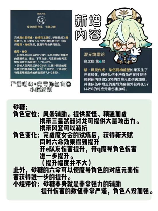 小煜评价:砂糖本身就是非常强力的辅助,人称大万叶,提升伤害的数值非常严谨,角色人设加强了一波。
