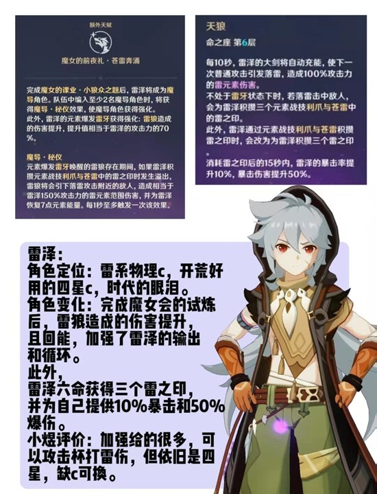 大招中雷狼造成的伤害提升,且回复7点元素能量,加强了雷泽的输出和循环。