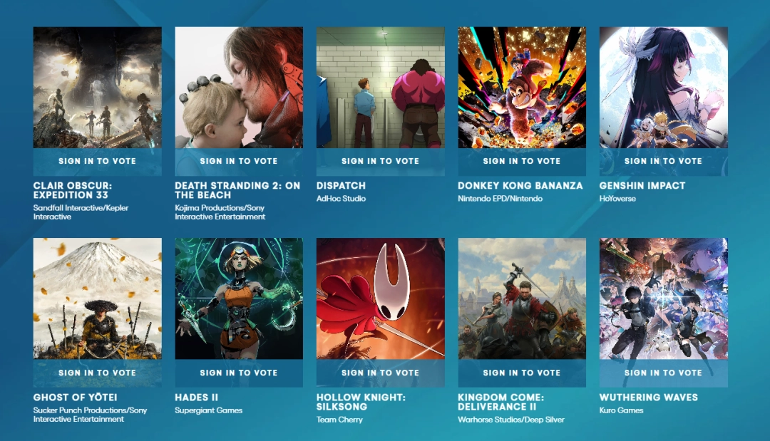 成功晋级第二轮的十款游戏名单如下:《羊蹄山之魂》、《哈迪斯2》、《空洞骑士:丝之歌》、《天国:拯救2》、《光与影:33号远征队》、《死亡搁浅2》、《超英派遣中心》、《咚奇刚:蕉力全开》、《原神》、《鸣潮》。