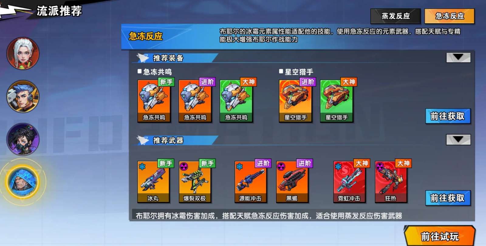武器搭配上面不同角色有着不一样的流派,新手的话前期ur抽到什么就先用什么,不需要非要去抽到流派中的武器,只要属性是对的即可,后期获得了再来进行替换,流派方面目前比较强的有妮娅的过载、布耶尔的急冻,以及李的放电。