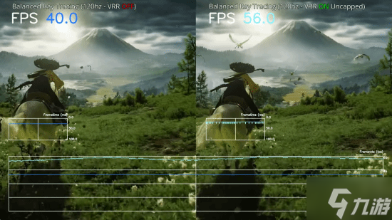在新增的均衡模式下,关闭VRR的帧率为40帧,开启VRR后帧率能达到60帧,复杂的场景会降到50多帧。