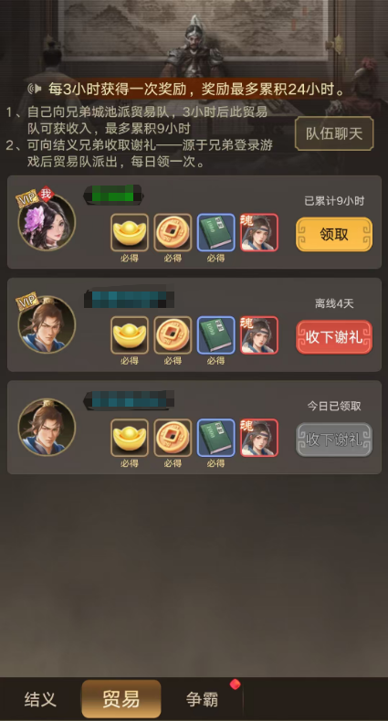 1)贸易可以让结义兄弟之间,每3小时产生一次贸易收益,获取元宝等道具;
