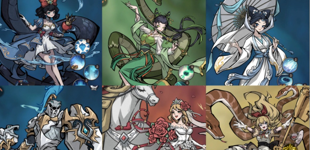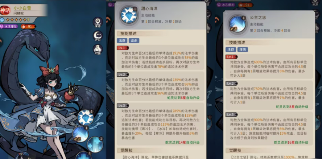 2、进阶神话追击流阵容:小小白雪 + 蛇灵小青 + 白娘子 + 骑士明妮 + 玫瑰公主 + 爱丽丝