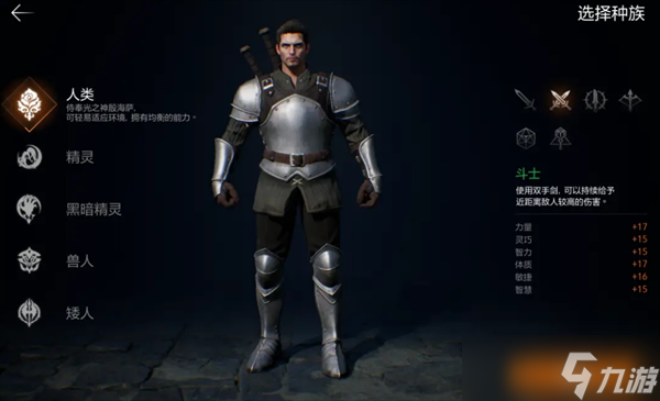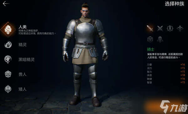 比如人类选择单手剑时,整体攻守能力以及数值更均衡,精灵选单手剑时则防御更高,兽人单手剑则力量和体力值更高;
