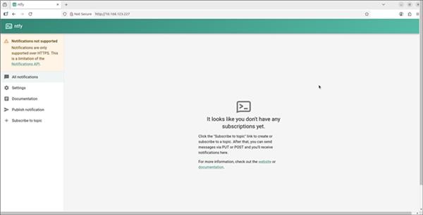 容器启动成功后,ntfy服务即已在局域网内上线。此时,您可以尝试在同局域网的浏览器中访问 http://本地IP(例如本例中的 http://10.168.123.227),如果能看到简洁的ntfy Web交互界面,即说明本地部署无误。