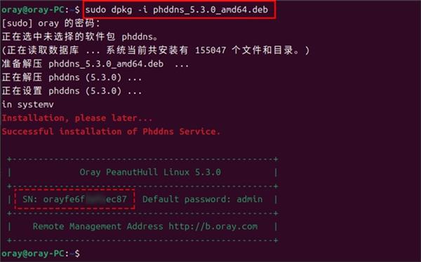 安装过程会自动注册服务,终端将直接输出该设备的 SN码(序列号)和默认密码(admin)。请务必记录下这组凭证,它是后续登录云端管理平台的唯一身份标识。
