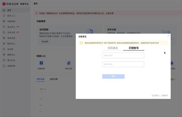 使用SN码登录管理平台后,系统会提示进行设备激活,您可以选择使用花生壳APP扫码或输入贝锐账号密码进行绑定。激活完成后,点击左侧的“内网穿透”菜单,进入核心配置环节。