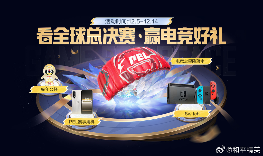 12月5日-12月14日,通过订阅赛程、观看和平精英全球总决赛-决赛阶段、为PEL赛区加油,获取抽奖券、消耗抽奖券有机会抽取PEL赛事用机、电竞之星降落伞等赛事好礼!