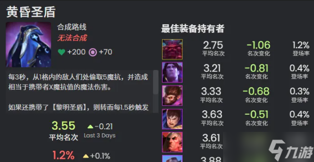 黎明圣盾:每3秒,从1格内的敌人们处偷取5护甲,并治疗相当于携带者X护甲值的生命值。如果还携带了【黄昏圣盾】,则转而每1.5秒触发这件装备的效果。治疗效果基于阶段提升。