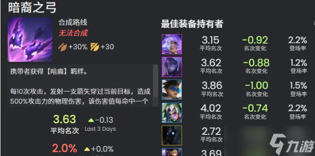 暗裔之弓:每10次攻击,发射一支箭矢穿过当前目标,造成500%攻击力的物理伤害,该伤害值每命中一个敌人就会降低33%。