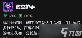虚空护手:战斗开始时:储存25%最大生命值,并且每秒多储存2%。在阵亡时,释放相当于生命值储量的魔法伤害,分摊给半径4格内的敌人们。