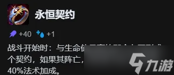永恒契约:战斗开始时:与生命值最高的那个友军形成一个契约,如果其阵亡,则获得10法力回复和40%法术加成。当该友军使用其技能时,获得6法力值。每6秒,为该友军提供护盾值,数额相当于携带者的150%法术加成。