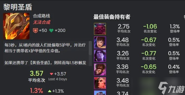 黎明圣盾:每3秒,从1格内的敌人们处偷取5护甲,并治疗相当于携带者X护甲值的生命值。如果还携带了【黄昏圣盾】,则转而每1.5秒触发这件装备的效果。治疗效果基于阶段提升。