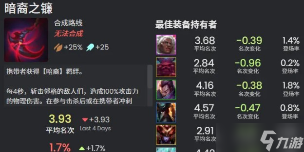 暗裔之镰:每4秒,斩击邻格的敌人们,造成100%攻击力的物理伤害。在参与击杀后或在携带者冲刺时,再次斩击。冲刺冷却时间:1.5秒
