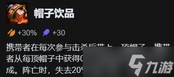 帽子饮品:携带者在每次参与击杀后带上一顶帽子。携带者从每顶帽子中获得0.75%物理加成和法术加成。阵亡时,失去20%总帽子数。(帽子数:??)