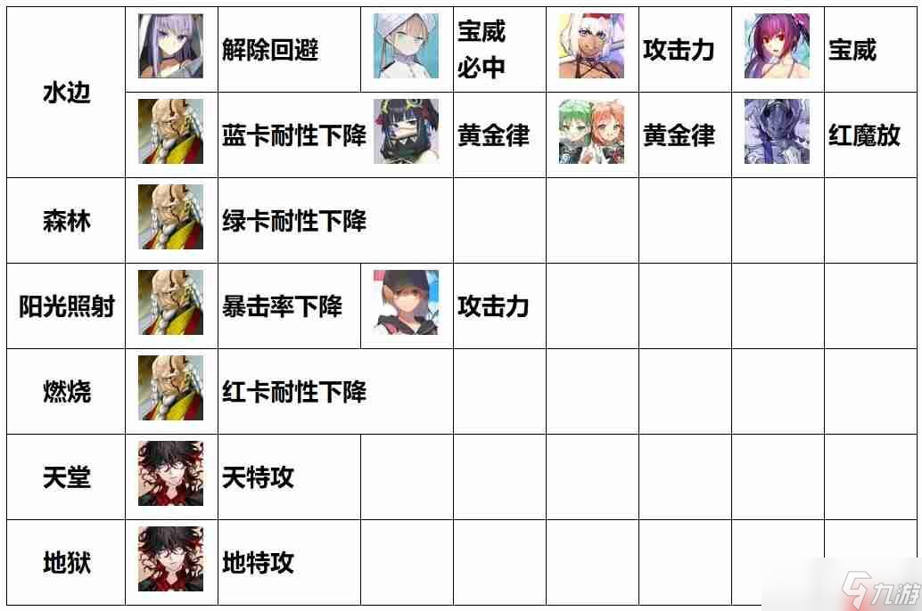 上图为可在特定场地下获得技能或职阶技能强化的从者名单。其中,“水边”场地覆盖范围最广,相关从者数量较多,且所提供的增益效果较为优质。