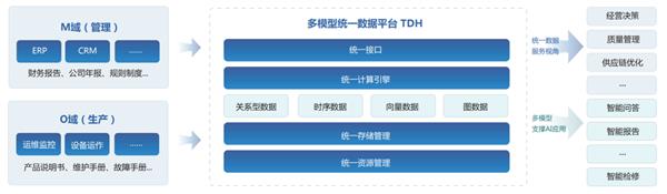 TDH强大的多模型能力使其成为一个真正“AI-Ready”的数据平台。通过整合管理域(M域)和生产域(O域)的数据,TDH能够构建统一的数据服务视角,为AI大模型应用提供高质量、多维度的训练和推理数据。这在实践中意味着打破了传统分析型系统(如ERP、CRM)与生产型系统(如物联网设备数据)之间的壁垒,创建了一个统一的数据基础,使AI模型能从企业全业务流程中获取洞察,而非仅仅是孤立的数据片段。这种一体化支撑“AI x Data”场景的能力,帮助企业将沉睡的数据资产转化为可用于大模型的知识,从而全面释放数据价值,加速AI应用的落地。