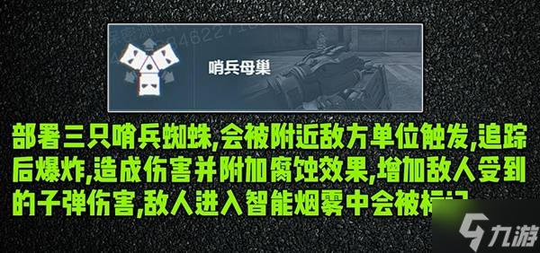 抛出一个巡猎蜘蛛,发现敌人会发射捕网,使敌人移动能力大幅受限,无法开镜与使用干员道具,如果敌人处干腐蚀状态,蜘蛛会直接追踪。