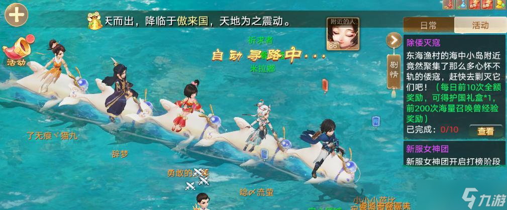 这个活动组队不难,在世界频道喊一下就有人来了,然后根据活动指引,一个小队骑着白海豚,在东海附近打倭寇就可以了。不得不说,大话官方是懂起名字的,项目组看得出来非常关心时事,连活动推出的时间都这么精准~