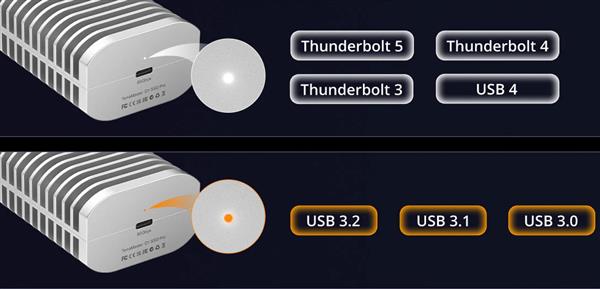 D1 SSD Pro 配备的智能指示灯,提供直观的“视觉诊断”功能。它能够自动识别当前的连接协议:当接入 Thunderbolt 5/4/3 或 USB4 等超高速接口时,指示灯呈现白色,代表设备正运行在巅峰性能状态;当接入 USB 3.2及以下规格的接口时,指示灯则显示为橙色,提示当前为常规速度。您无需任何软件,仅凭一瞥即可确认连接状态是否最优,快速定位速度瓶颈 。