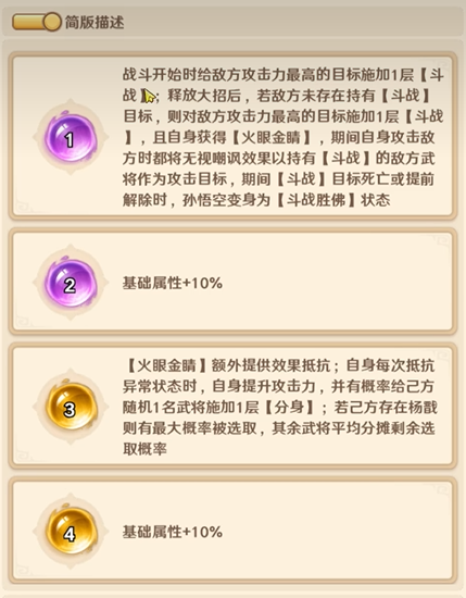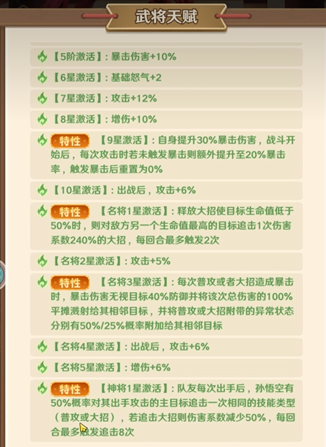 名将1星天赋进一步强化其战场统治力:当大招将目标压至50%生命以下时,自动锁定当前场上血量最高的另一名敌方单位,发动一次系数为240%的追加攻击,每回合最多触发2次。此效果使孙悟空兼具精准收割与群体威慑能力,在多目标环境中亦能维持高威胁输出节奏。