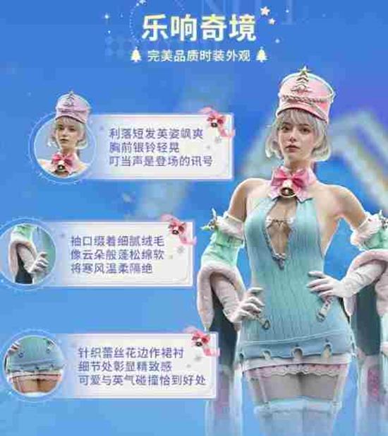 本次宝箱中最受瞩目的莫过于「乐响奇境」系列时装。该系列包括男女两款设计,以完美品质的时装外观呈现。男性角色的时装以利落短发搭配英姿飒爽的设计,胸前的银铃轻晃,仿佛是战场上的讯号。女性角色则以针织蕾丝花边作裙衬,袖口缀着细腻绒毛,像云朵般蓬松绵软,细节处彰显精致感,可爱与英气碰撞恰到好处。