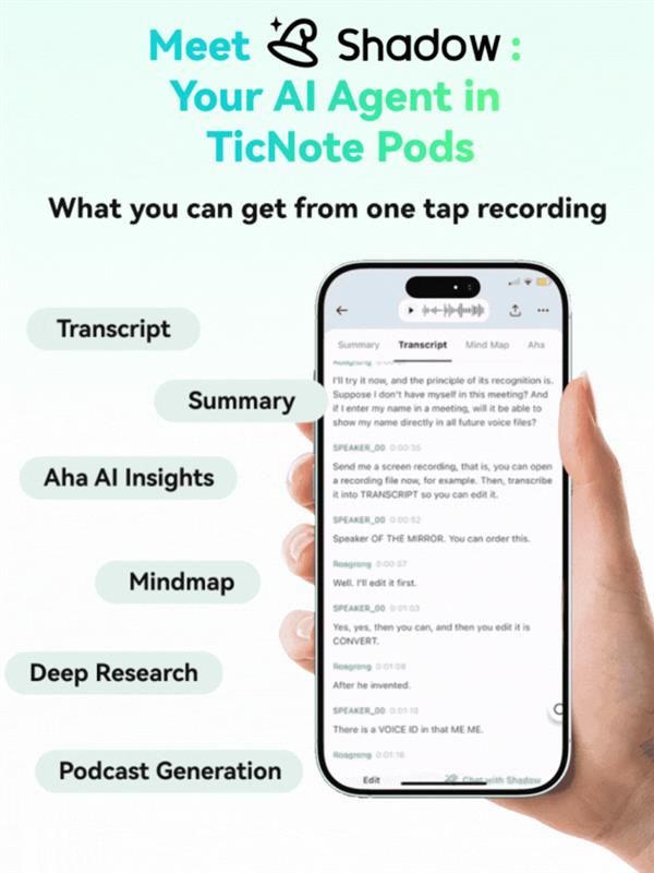 TicNote Pods以轻量机身、长续航能力、耳机与充电仓的双录音通道、10米远距离收声等优势,为「Shadow AI」提供了稳定、高效的数据入口。
