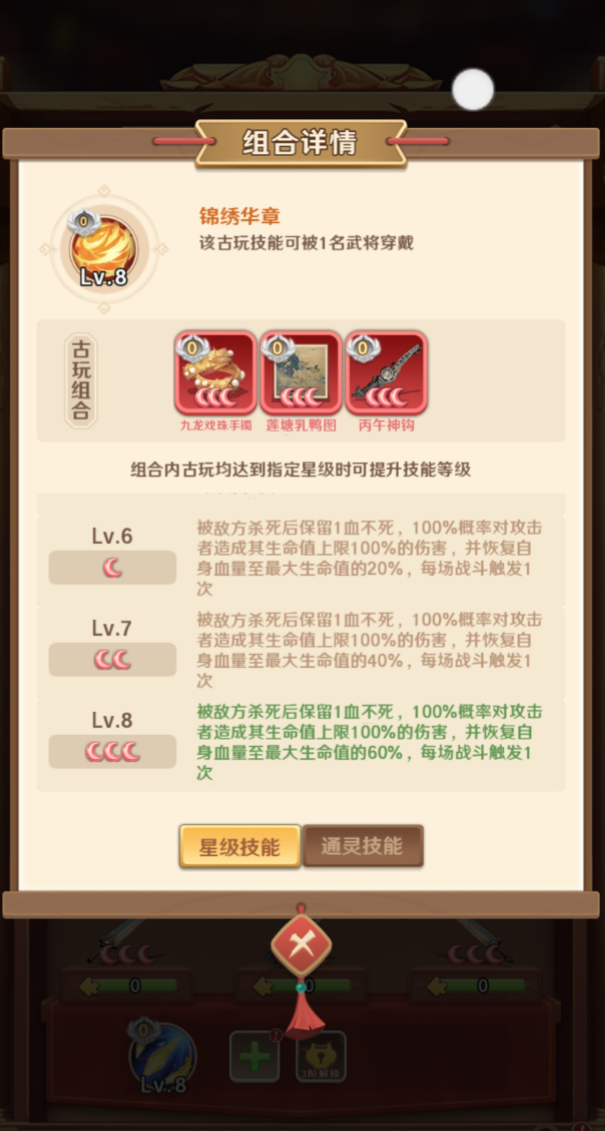 鸣金奏玉:由虢叔旅钟、虎戟镈、成周铃组成,作为生存续航流,它比较适合高难度的副本,或者是玩家直接去参加跨服战斗,目前是需要持久战的。众多场景当中,对于玩家来说,这个古玩适合中后期,它有效的能够提升队伍的容错率,目前适用的场景比较多,它能够有效的保护核心的输出或者是辅助,避免被集火秒杀。对于这个流派,出战之后将会获得重生的状态,一旦一名武将的血量直接为零之后,如果说战场上还有同生的武将,则自身不死病。并且另外一名同生的武将血量将会回满。