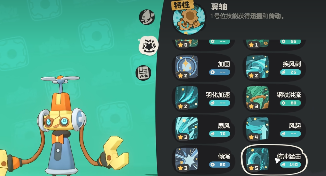 帕帕斯卡在PVP里面的定位非常明确,就是靠着九个细别相性的抵抗能力站场输出。这只精灵的特性叫做翼轴,会让1号位的技能获得迅捷和传动效果。传动的意思就是回合结束后技能会往下移动一个位置,所以每次进场的时候技能顺序都会变化,这个细节必须要记清楚,不然战斗中容易搞混。轴承支撑这个技能也很关键,它周围的技能能耗会减少一倍,主动点击之后周围技能直接减2费,配合传动机制可以灵活调整技能释放的节奏。