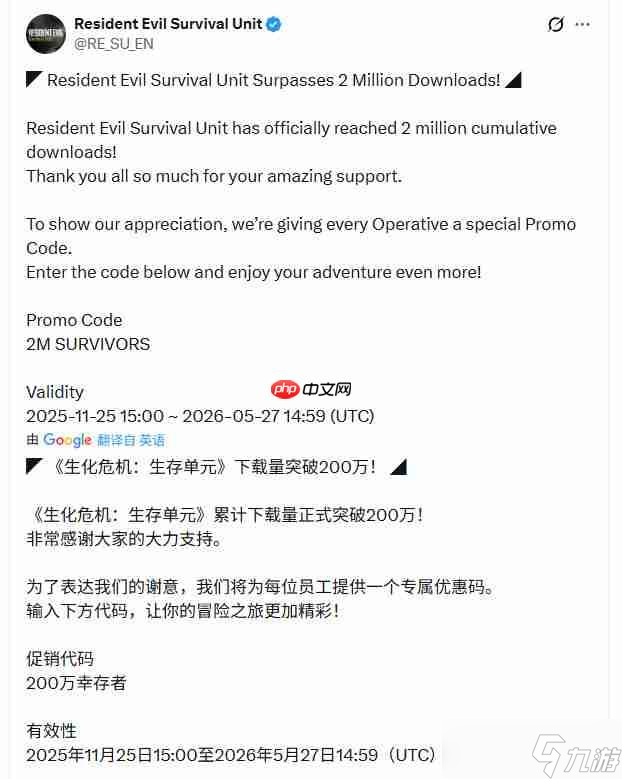 为庆祝这一里程碑并回馈玩家支持,Aniplex与JOYCITY特别推出感恩活动,所有玩家均可通过游戏内兑换网站输入奖励代码“2M SURVIVORS”领取专属游戏道具。