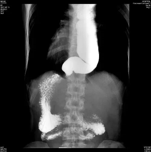 给食管拍“动态 X 光”,你需要喝一种白色的钡剂(像牛奶一样的液体),然后在 X 光下观察它通过食管的过程。贲门失弛缓症患者的贲门部位会出现典型的“鸟嘴样”狭窄——食管末端像鸟嘴一样收紧,上面的食管却明显扩张,还能看到钡剂在食管里“慢慢悠悠下不去”。