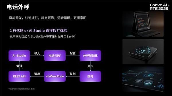 声网一直希望将对话式 AI 能力赋予到电话中,正式在2.0 版本中推出电话外呼功能,支持SIP/PSTN 电话,开发者可以通过声网最新发布的对话式 AI Studio 进行工作流编排,通过 UI 手动配给就可以完成电话拨打,导入号码,审核完成后,直接绑定外呼智能体,再点击拨打。如果想在生产中部署,可以通过一行代码拨打电话,非常便捷,且稳定性可靠。