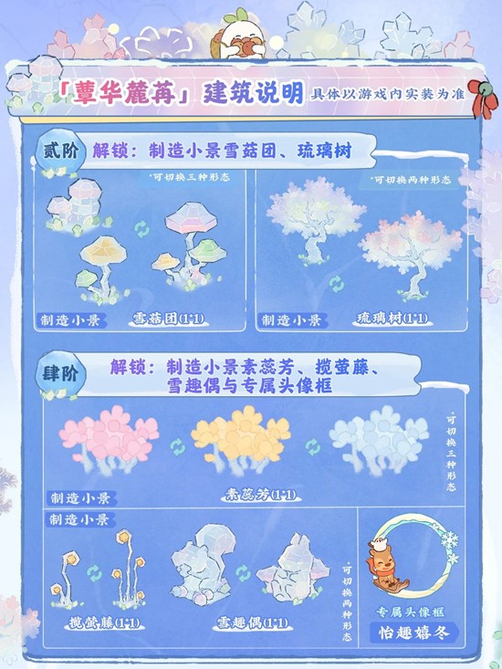 本期限时UP建筑创物池将会上架甲等建筑「蕈华麓苒」。该建筑不仅拥有随季节变换的双形态,还能制作丙等建筑「雪菇团」、「琉璃树」、「素蕊芳」、「揽萤藤」、「雪趣偶」,更有专属头像框和彩蛋期待大家解锁!此外,乙等建筑「寒芝渡玉」、「团菌阁簇」,丙等建筑「鹿蹊冰」也将上架。