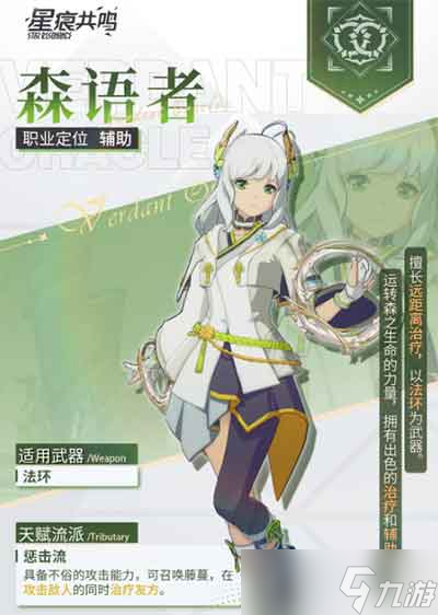 森语者属于辅助类型,他有着治疗量和增益效果,能保护队友带来生命保障并提升团队的整体实力,他同样可走惩戒和愈合两种流派,惩戒流自我攻击能力会更强,能召唤出藤蔓在进攻敌人的同时治疗自己的队友,愈合会更加专注于辅助,能保护队友生命并提供能力上的加持,他比较有代表性的招式有“再生脉冲”和“狂野绽放”,再生脉冲会向着周围释放出脉冲,对自身和接触到的队友进行治疗加驱散,狂野绽放则会会打出远距离的范围攻击,并治疗自身和生命最低的队友。