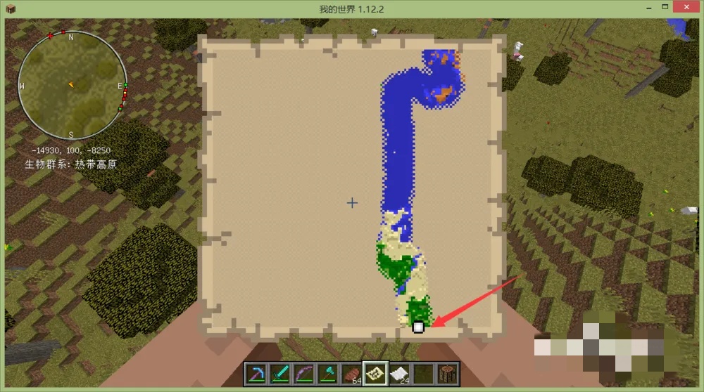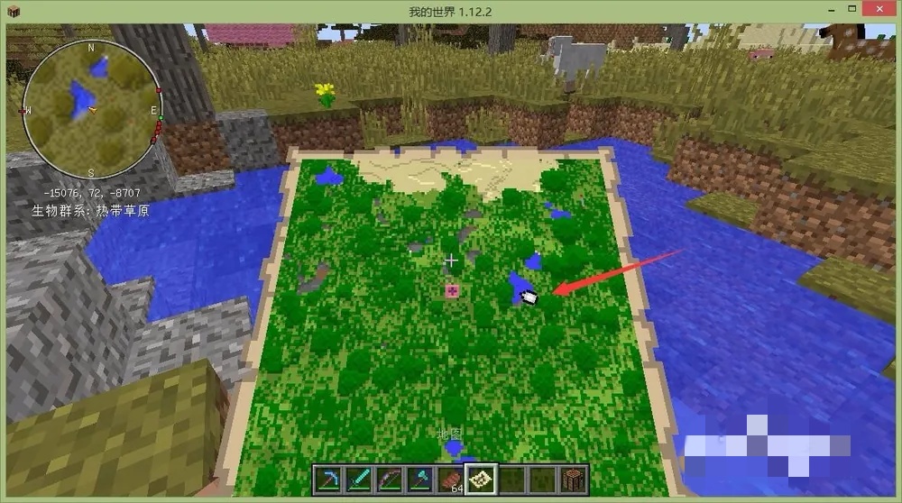 然后拿着地图,右键,让空地图显示出附近的地形,第一张地图显示的是很清晰的地貌,当然也是最小的地图。