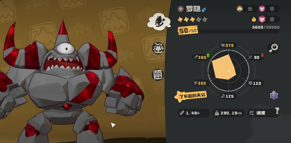 从种族值维度来看,罗隐总和为619,属于当前版本中梯队靠前的高数值精灵。其中物理攻击为最大亮点,数值显著高于同类输出型精灵;生命值设定合理,具备一定承伤能力,避免出现“一碰即碎”的脆皮问题;速度属性处于中等偏上水平,足以应对多数主流节奏对战;双防(防御与特防)虽未重点强化,但与其主攻定位高度契合,并非设计短板。