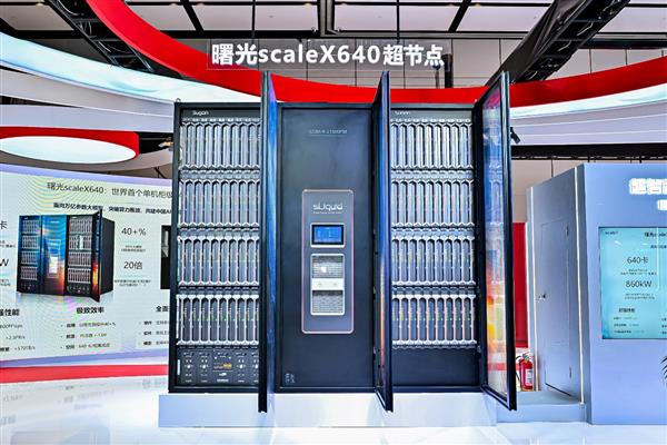 据悉,此次即将亮相的万卡超集群系统基于中科曙光scaleX640超节点技术设计。scaleX640超节点采用“一拖二”高密架构设计,并搭载国内自研高速互连网络技术,通过开放架构实现多品牌国产加速卡兼容适配,有效打破AI生态壁垒。