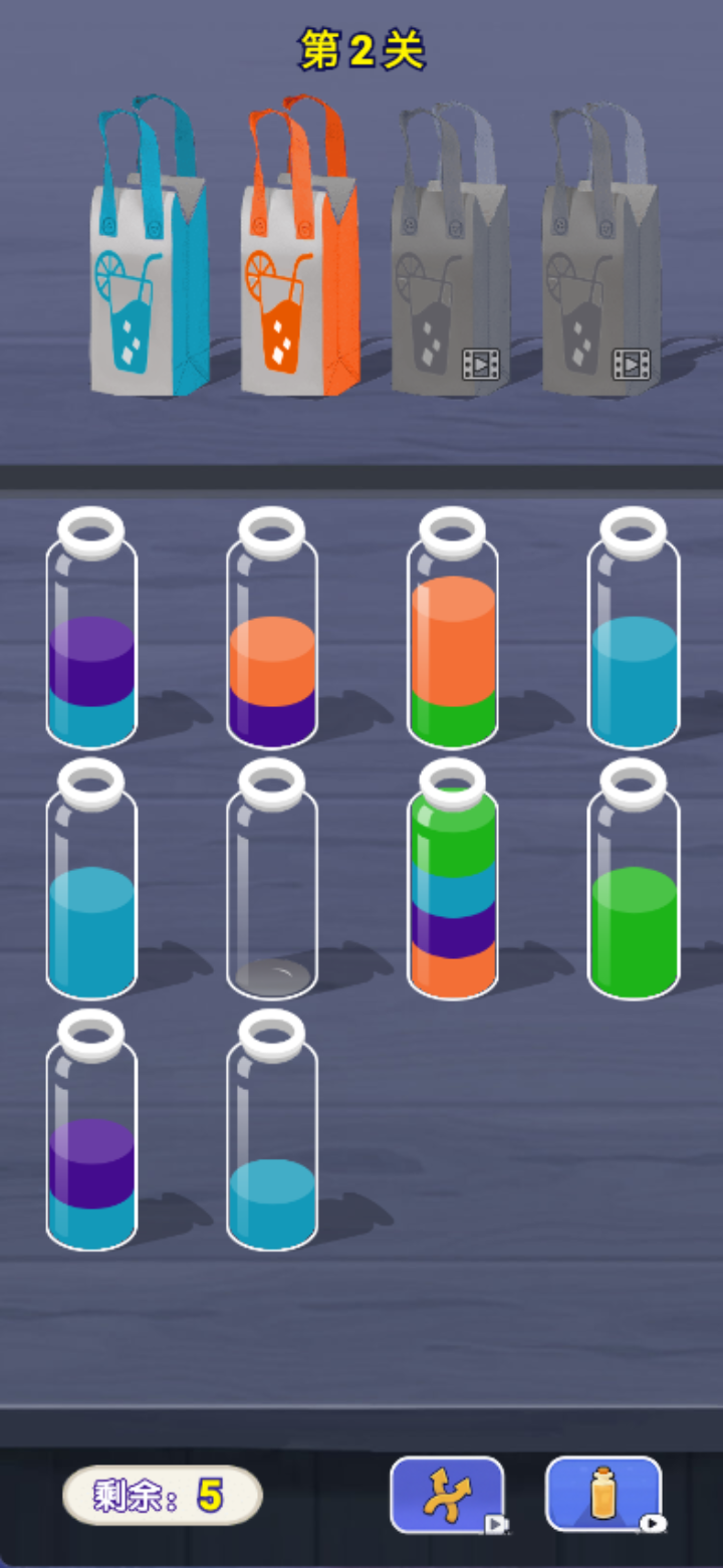 不同颜色的包装袋,不同颜色的水瓶