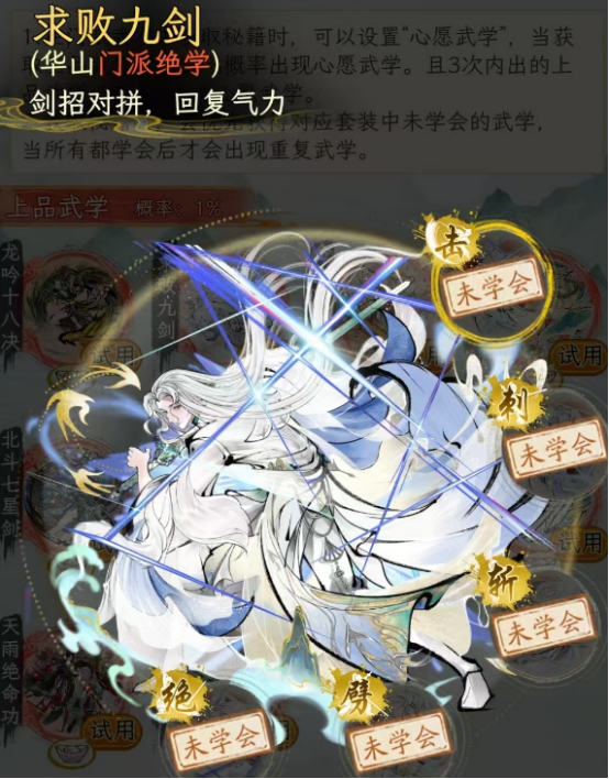 其次为大家推荐的就是丐帮派的绝学龙吟十八绝以及华山派的绝学求败九剑,其中丐帮派的武侠绝学,能够轻松击晕对方,导致受伤的一方没有办法行动,华山派在攻击之后能够快速恢复个人的气力,甚至也能够附加增益效果。这两个门派武学也是很推荐的,虽然并没有峨眉派以及少林派绝学内药过于强大,但依旧是非常不错的优质之选。