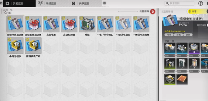 该胶囊产线具备原材料切换弹性:前期使用紫晶矿可生产普通胶囊;待蓝铁矿解锁后,无需重建产线,仅替换原料即可升级为高价值中级胶囊,显著节省营地空间与基建成本。电池类产线则需按供电等级分层建设:小型电池可直接调用系统预设蓝图;中型与大型电池需结合银地科技进度逐步解锁。当营地升级至银地二级后,仓库功能开放,资源获取方式由手动筛选转为自动化调度。针对终极电池,官方提供三套蓝图方案,若营地空间受限,可选用简易版——虽减少两组原石矿模块,但整体产能提升约1.5倍。