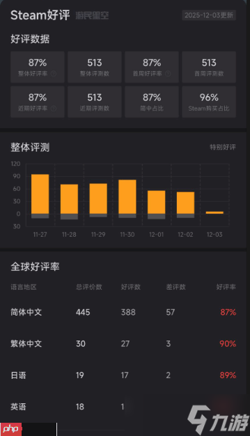 截至当前,游戏共收获513条用户评测,总体好评率达87%;其中简体中文区好评率同样为87%,繁体中文区达90%,英文区更是实现100%好评(样本量为18篇,基数较小)。