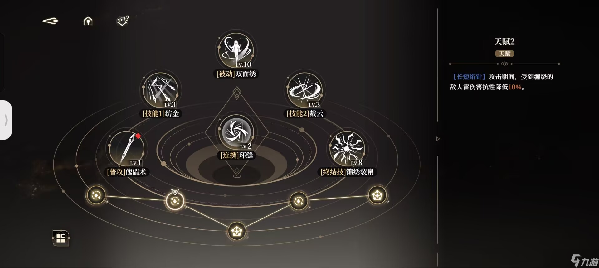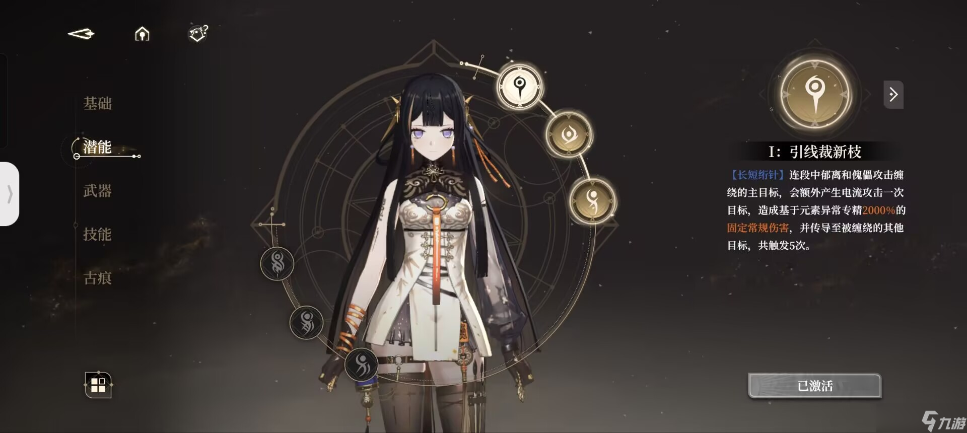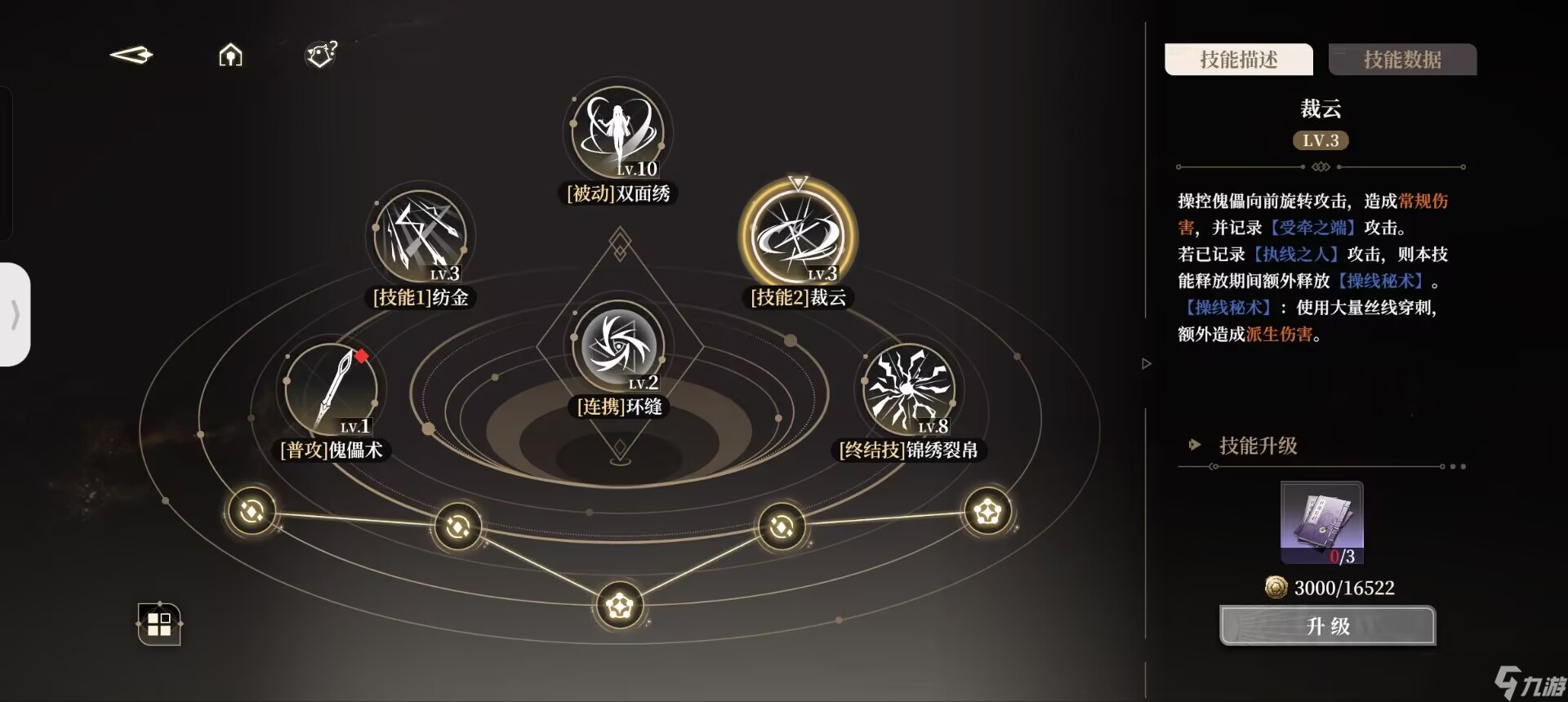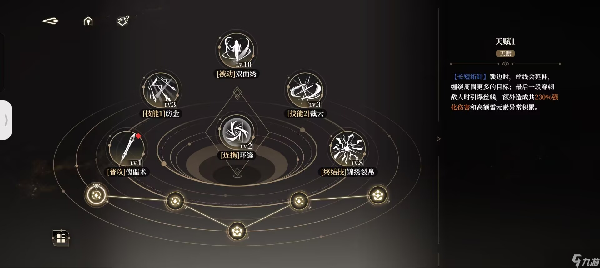 我们在使用过一技能后,会持有小郁离的印记,即【执线之人】。此时二技能则会转变为被动中的【操纵秘术】。同理,我们在使用过二技能以后,便会持有傀儡即大郁离的印记,即【受牵之端】,此后使用的一技能则会变为【螺旋绣术】。