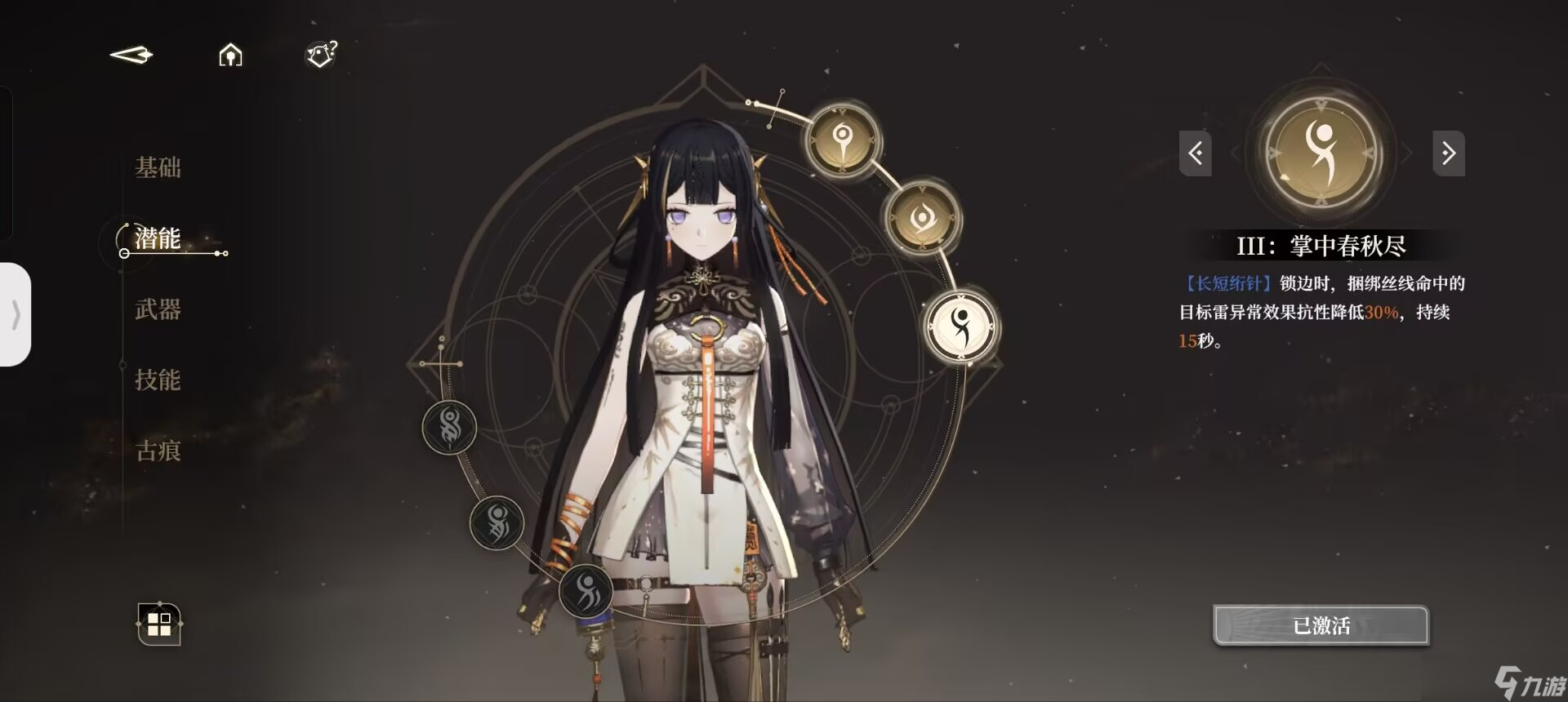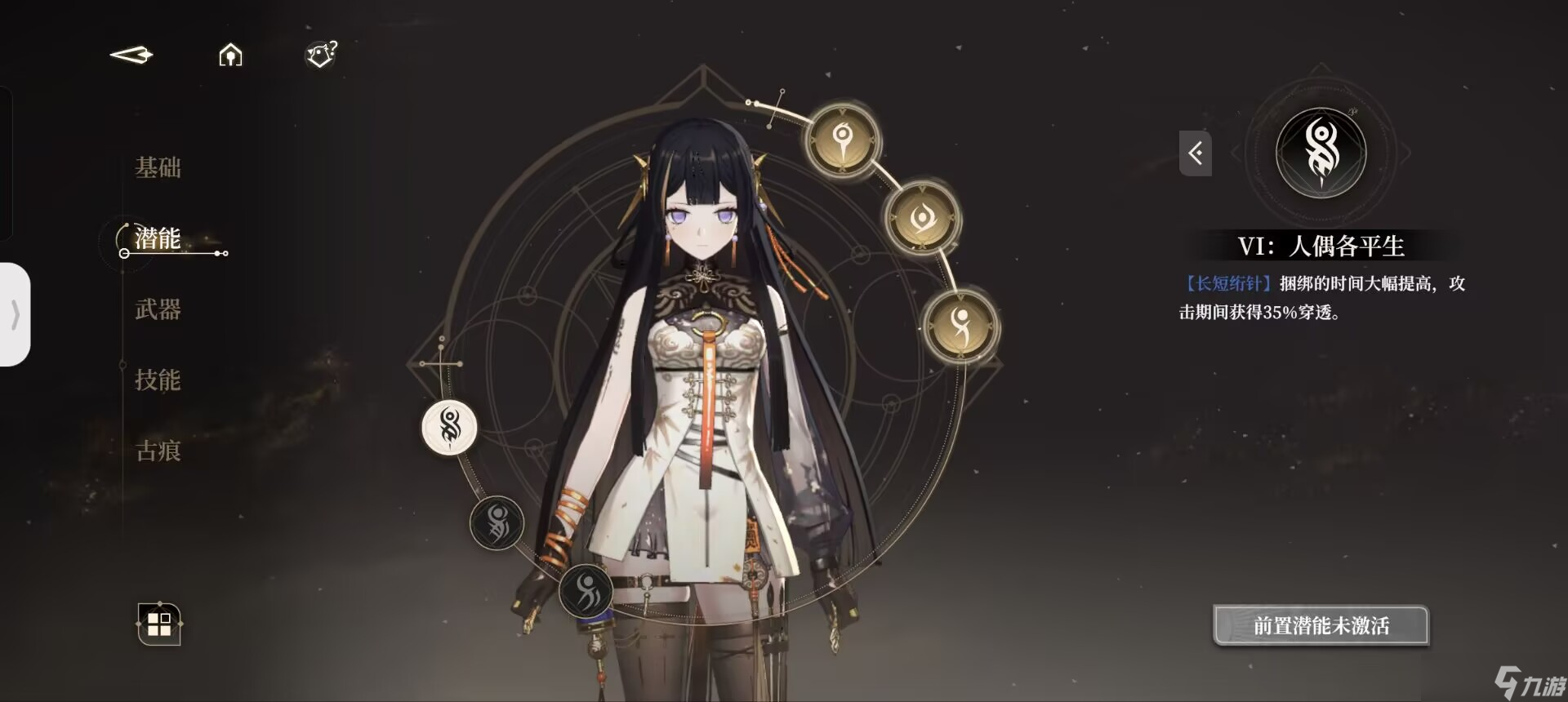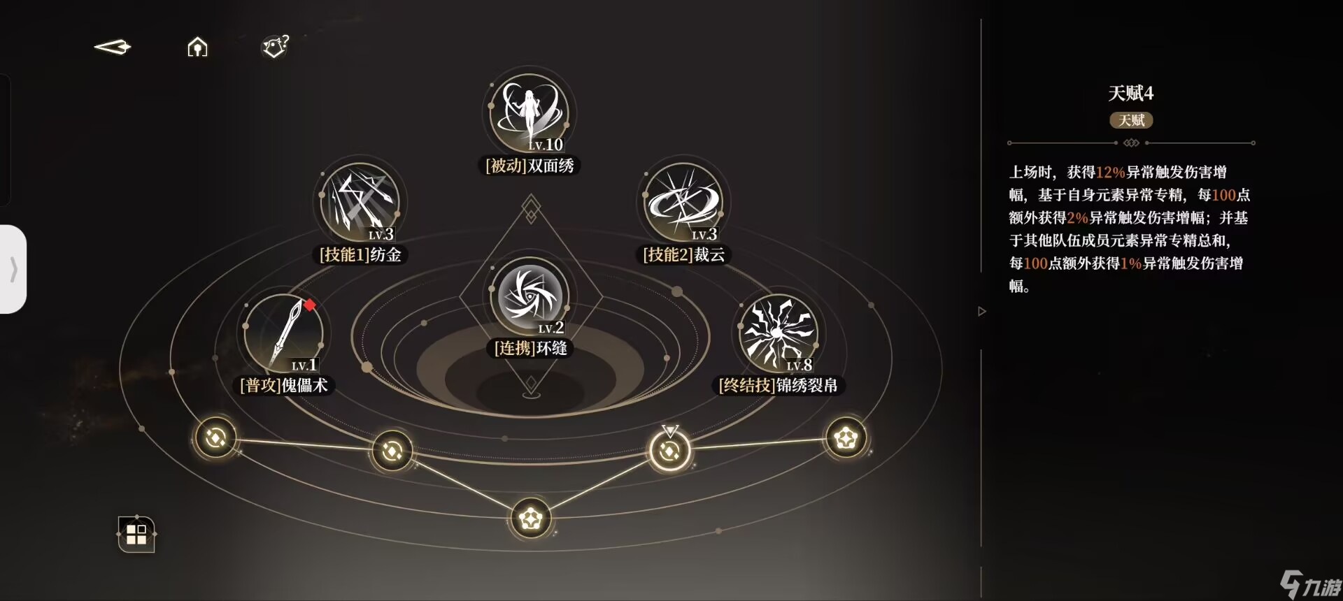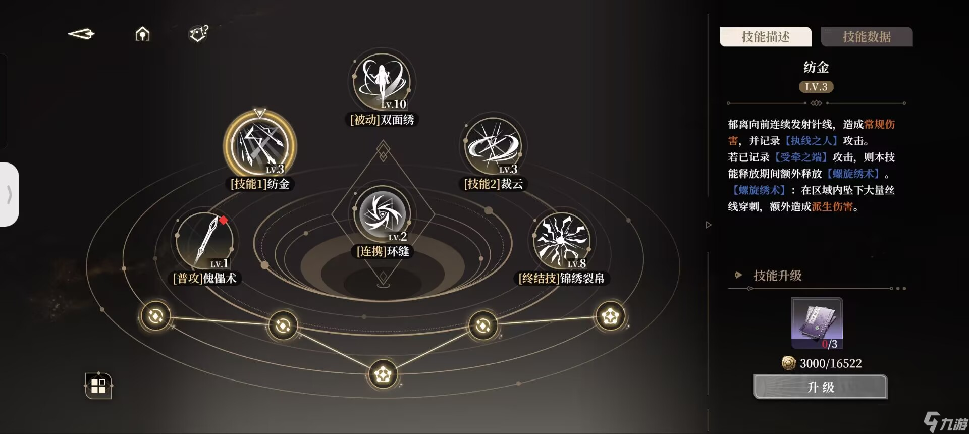 我们在使用过一技能后,会持有小郁离的印记,即【执线之人】。此时二技能则会转变为被动中的【操纵秘术】。同理,我们在使用过二技能以后,便会持有傀儡即大郁离的印记,即【受牵之端】,此后使用的一技能则会变为【螺旋绣术】。